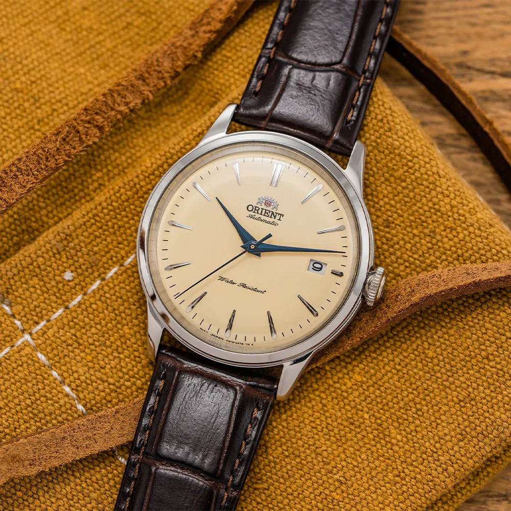 Orient is a Japanese manufacturer owned by Seiko Epson but produces its movements independently. The Bambino's signature is its domed mineral crystal over a domed dial, a combination that gives it a distinctly vintage look at a price that makes the competition difficult to justify. The in-house Cal. F6724 hacks and hand-winds, runs a 40-hour power reserve, and is accurate to roughly ±25 seconds per day. It's not a precision instrument. It's a reliable, characterful automatic that costs a fraction of what you'd pay for equivalent finishing from a Swiss brand.
