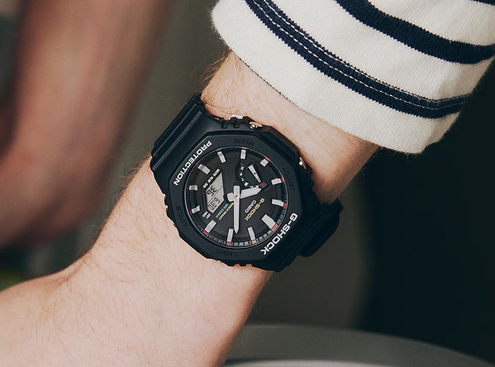 For those who find the DW-5600 too utilitarian, the GA-2100 is the answer. Its octagonal bezel draws an obvious comparison to the Audemars Piguet Royal Oak. At just 11.8mm thick it's the slimmest G-Shock ever made, weighs 51g, and still delivers 200m water resistance and full shock protection.